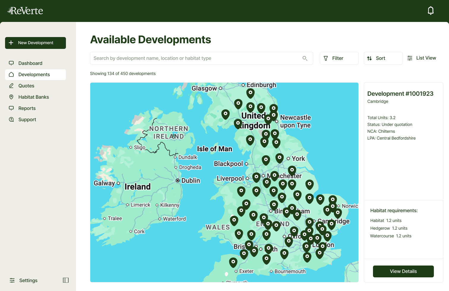 ReVerte is designed to simplify how off-site Biodiversity Net Gain is delivered. Developers can submit projects, define unit requirements, and compare quotes from multiple habitat banks, all in one place. Habitat banks can discover live developments, review requirements, and submit structured quotes with confidence and clarity.