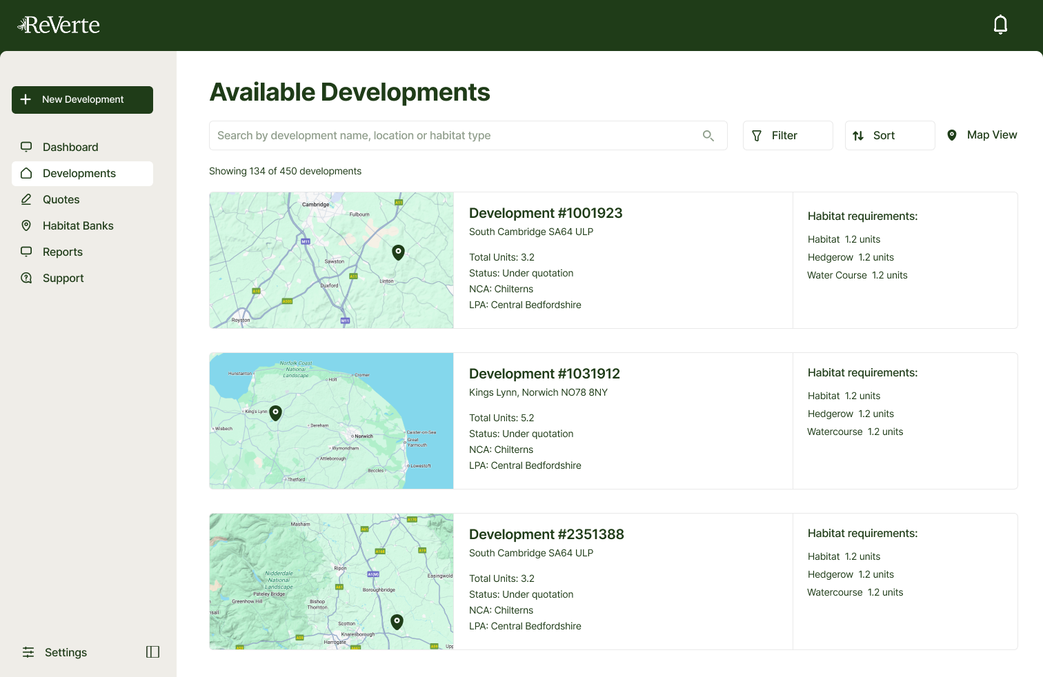 Access a live pipeline of BNG requirements, easily filtered by location and habitat type.